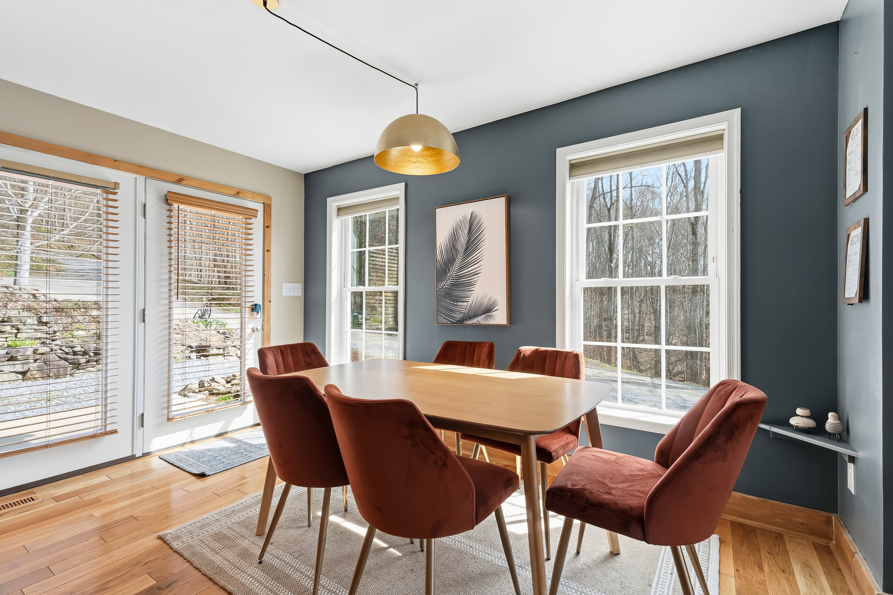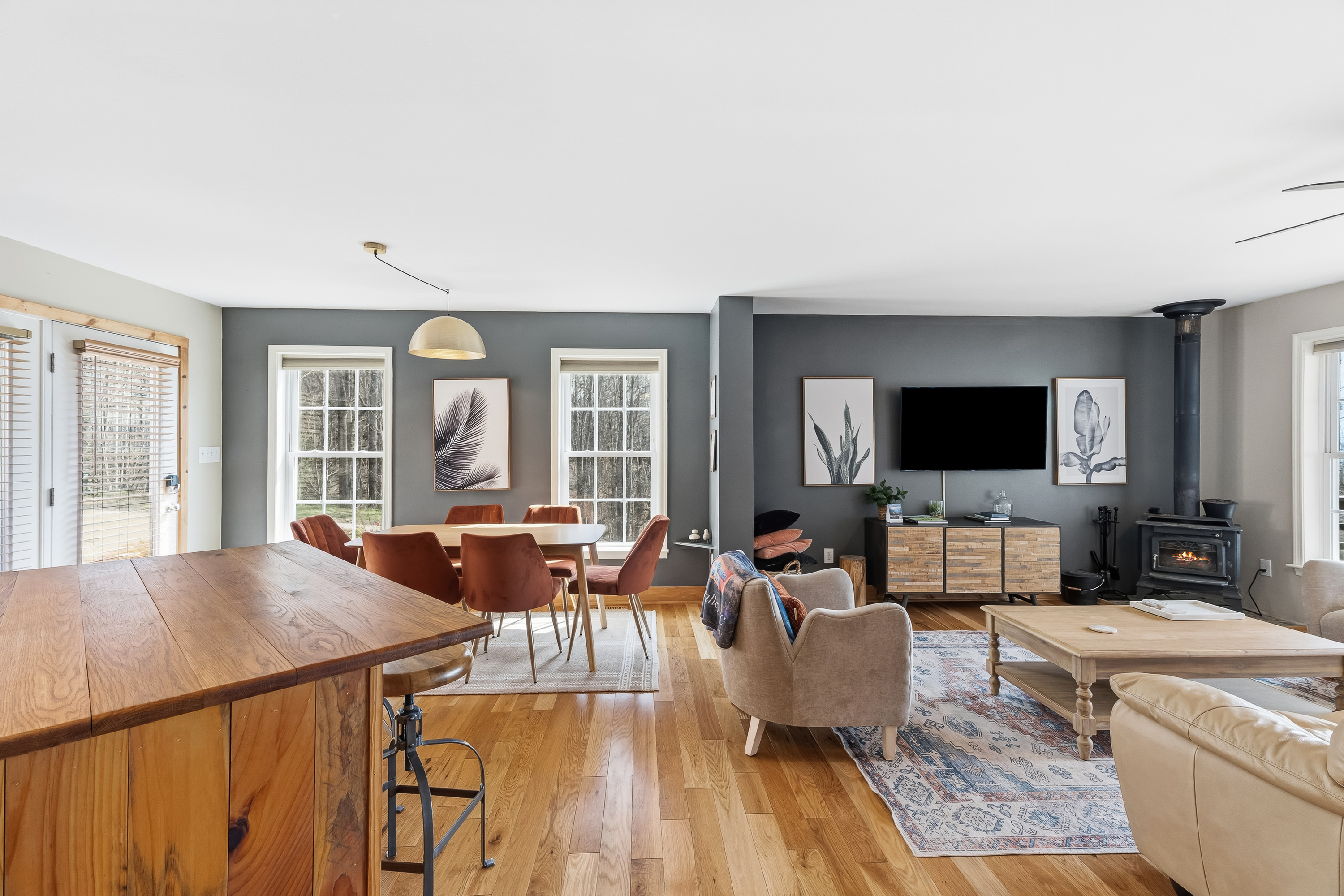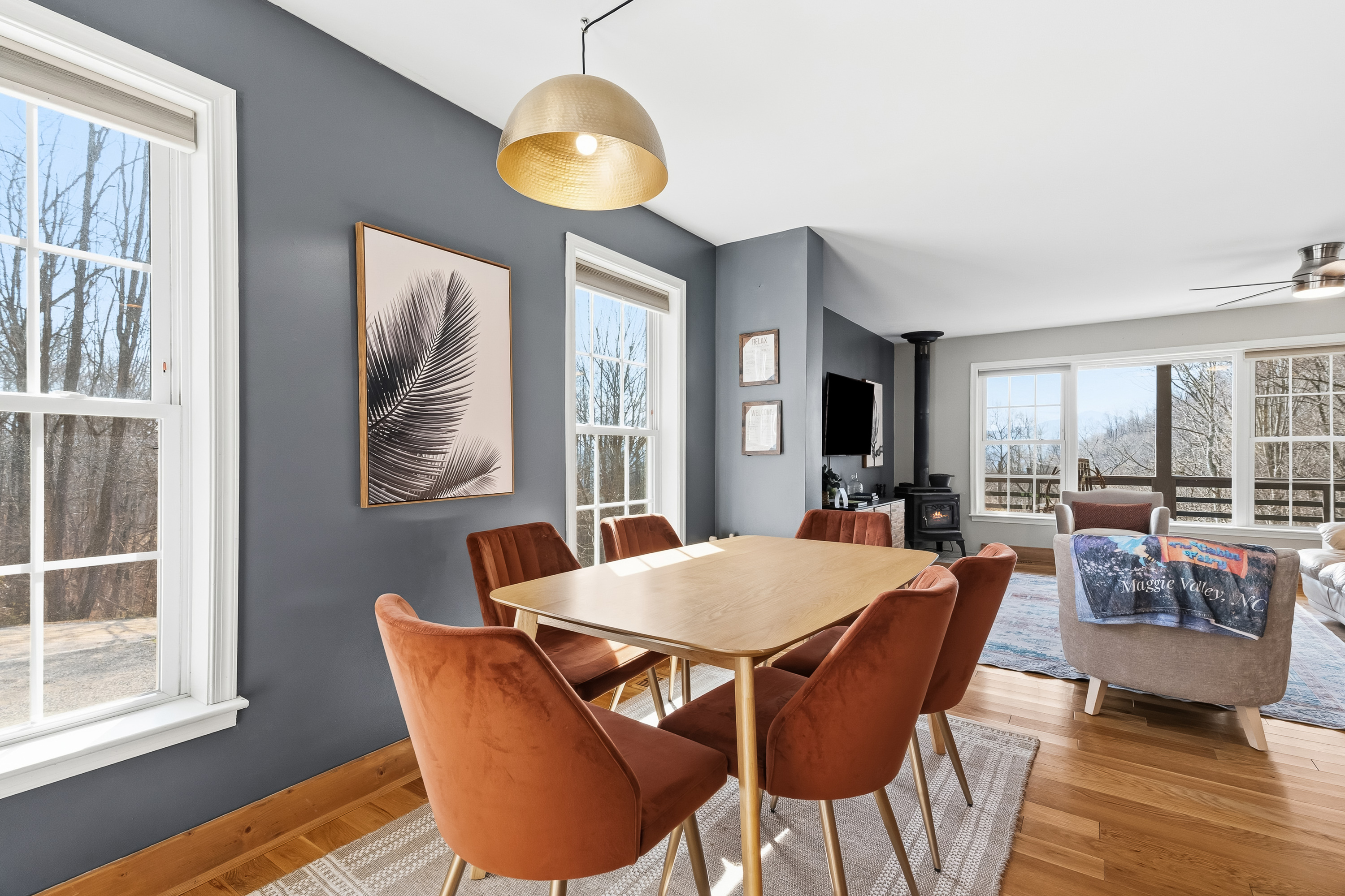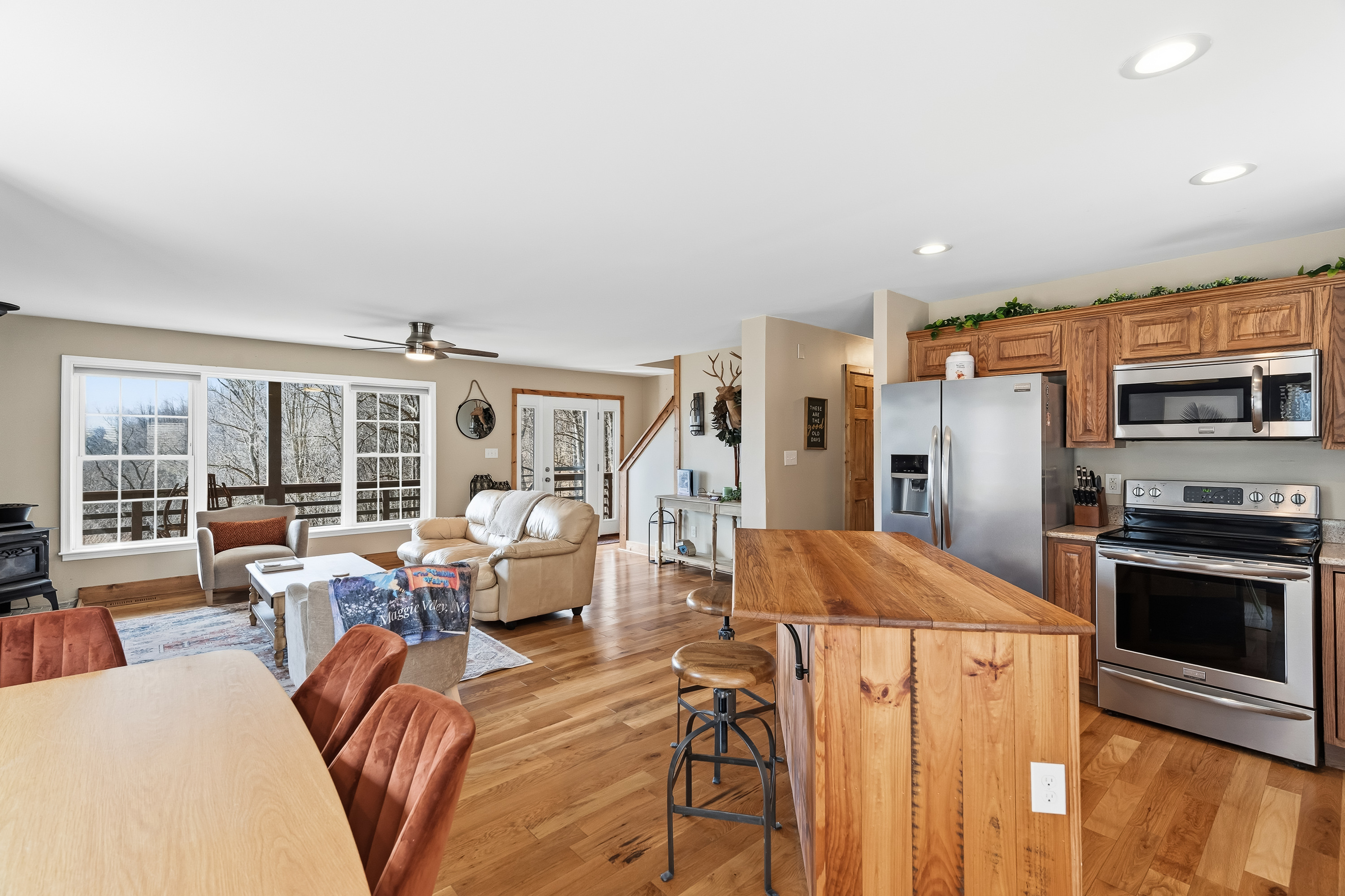 As you enter, the open-concept design creates an immediate sense of space and comfort. The main living area is anchored by a cozy fireplace and framed by expansive windows that bring in natural light and showcase near-panoramic mountain views. The kitchen and dining areas flow seamlessly, offering a layout that supports both quiet evenings and effortless entertaining, with direct access to outdoor grilling just steps away.