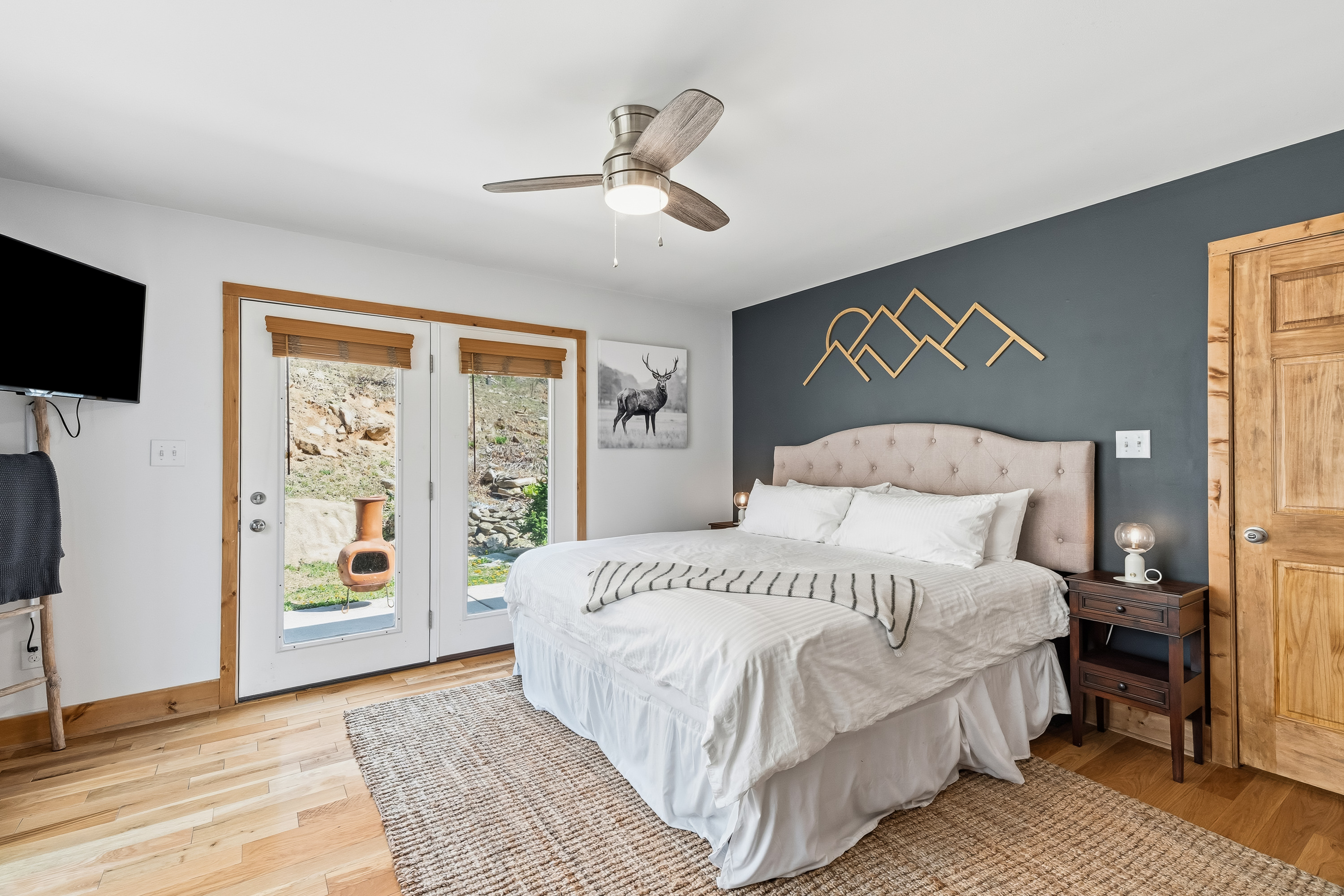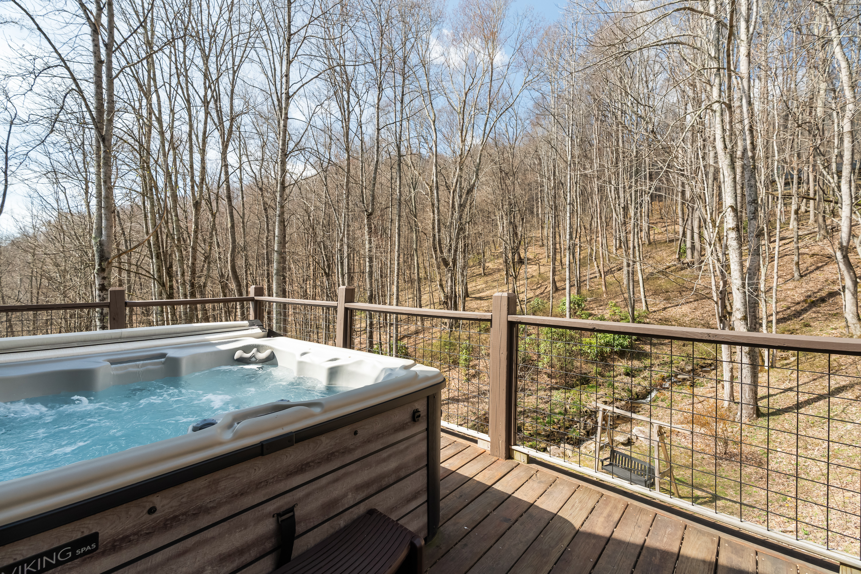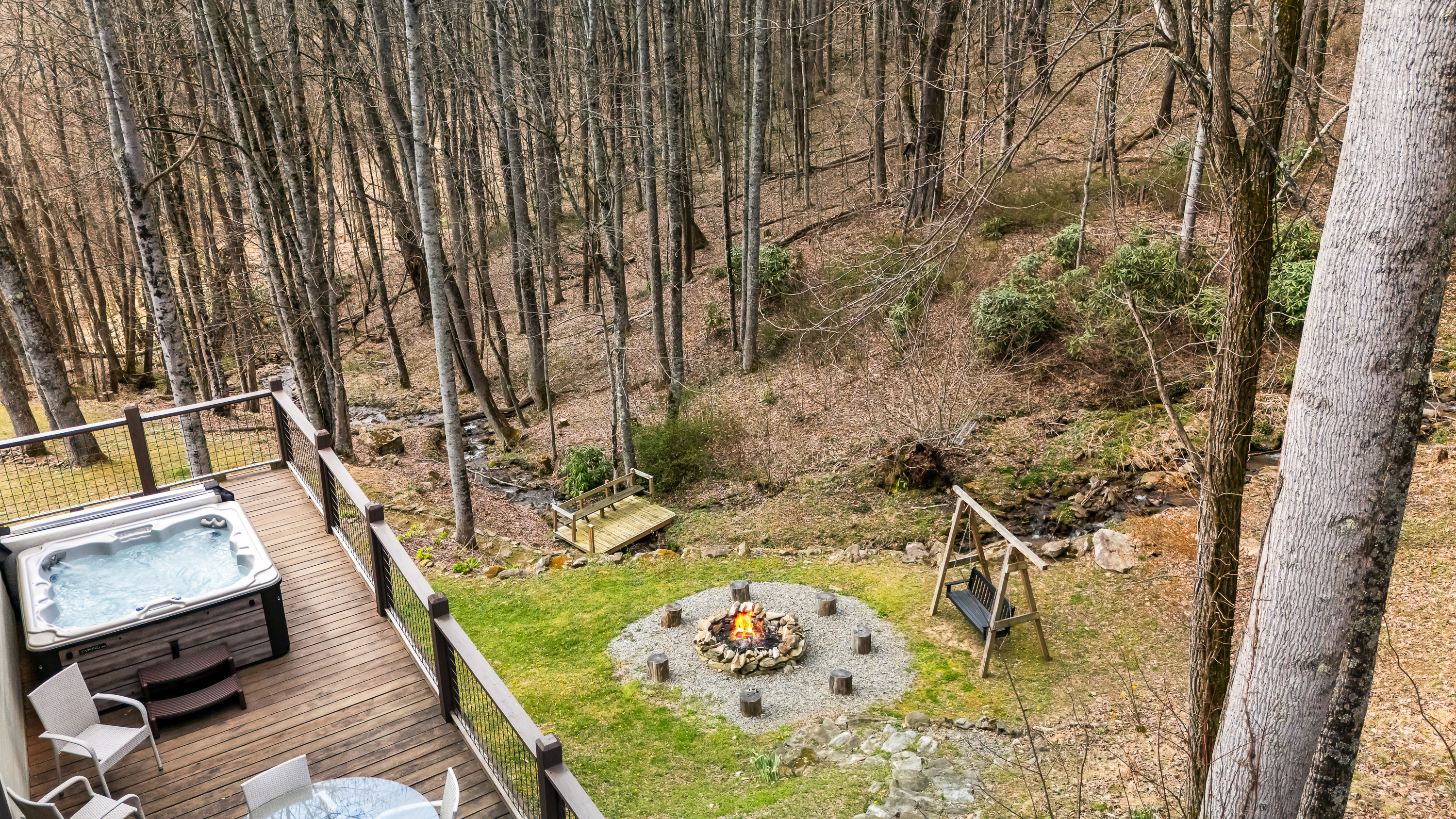 The outdoor spaces are where this property truly distinguishes itself. A wraparound porch with a private hot tub provides a place to relax and take in the surroundings, while below, a creekside fire pit and natural waterfall create a setting that feels peaceful, private, and memorable. The acreage surrounding the home enhances the experience, offering space to unwind, explore, and enjoy the natural environment.
