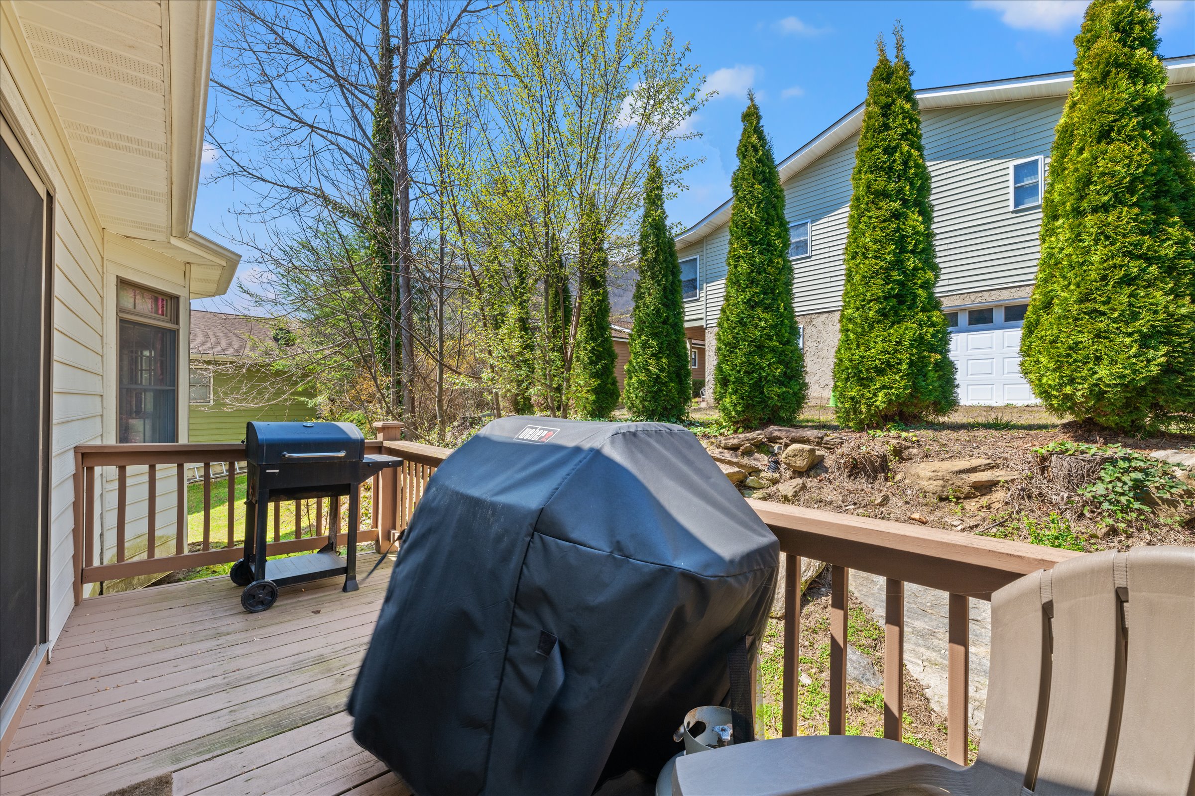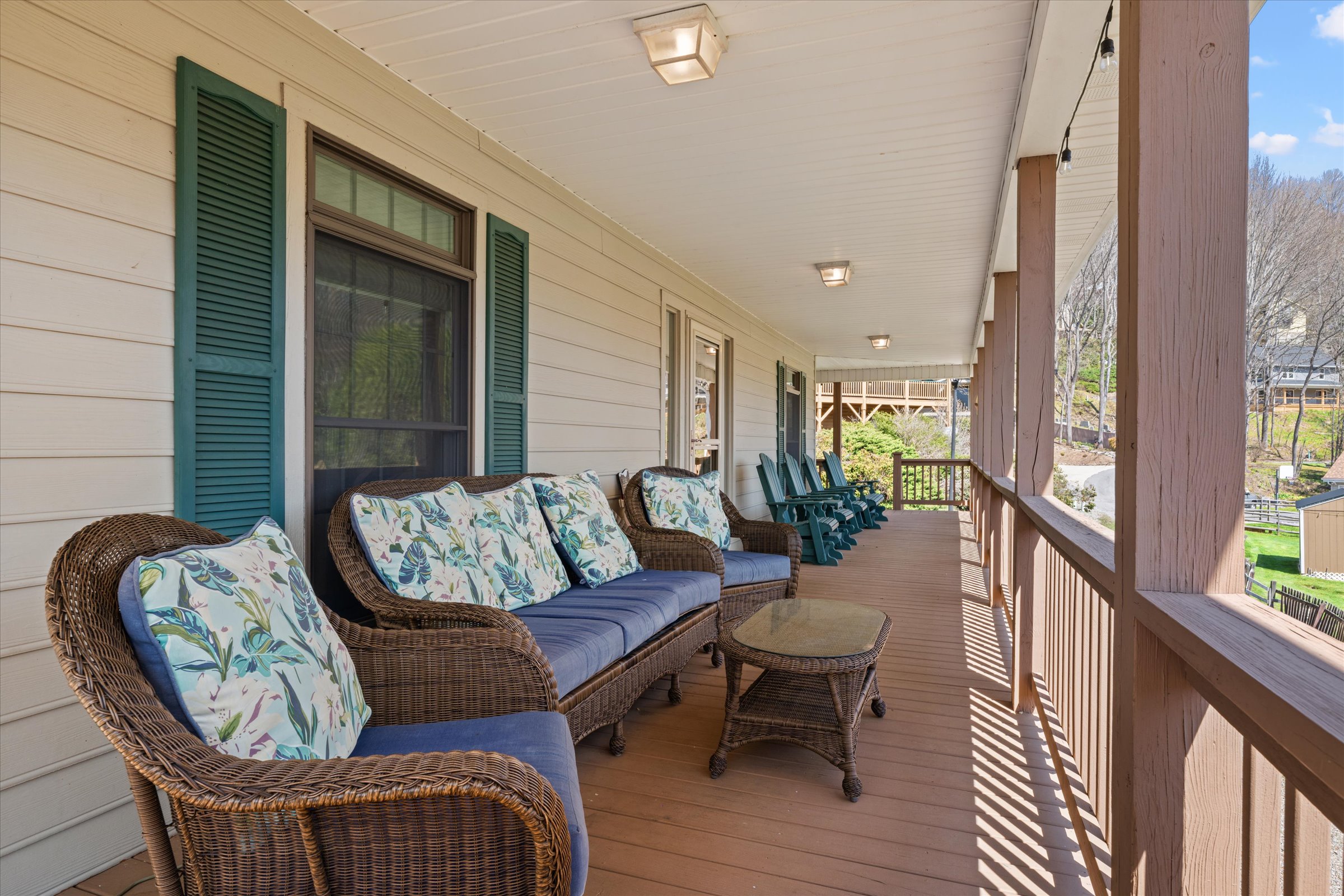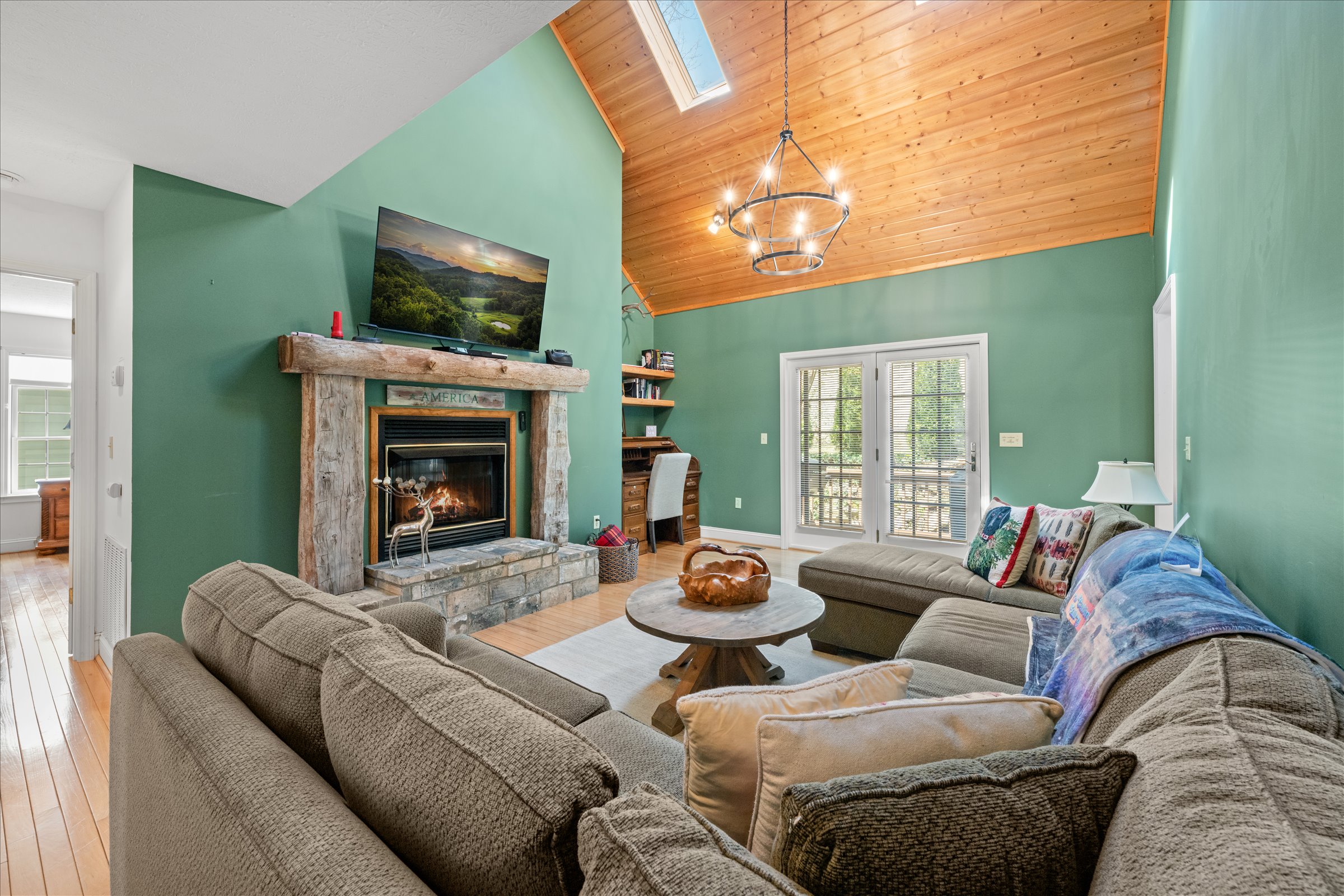 The outdoor experience is equally inviting. A wraparound deck captures mountain views and the gentle sounds of a nearby creek, creating a peaceful setting to unwind. The fire pit area, complete with Adirondack seating, offers a natural gathering space for evenings under the stars, while the yard provides additional room to enjoy the outdoors.