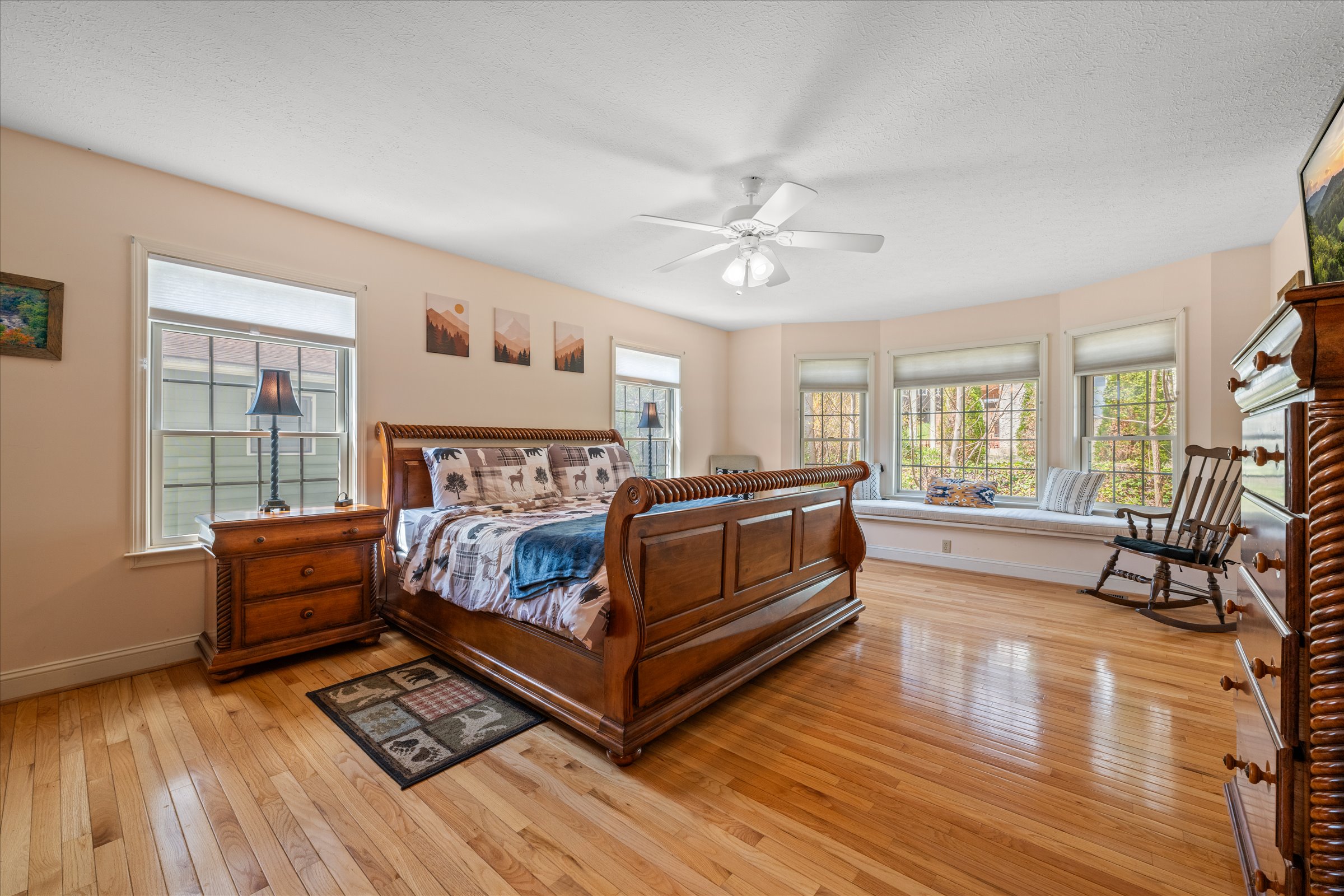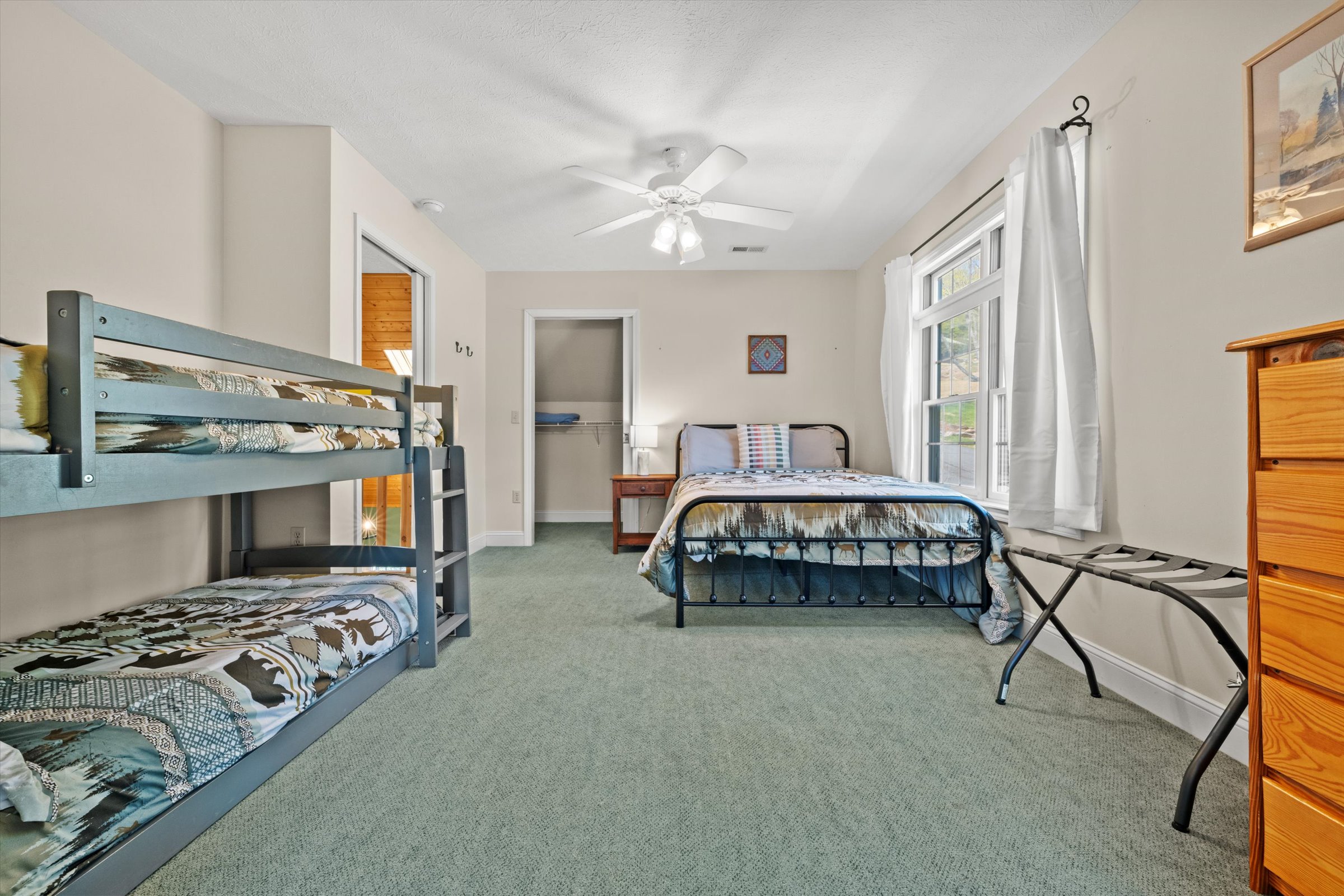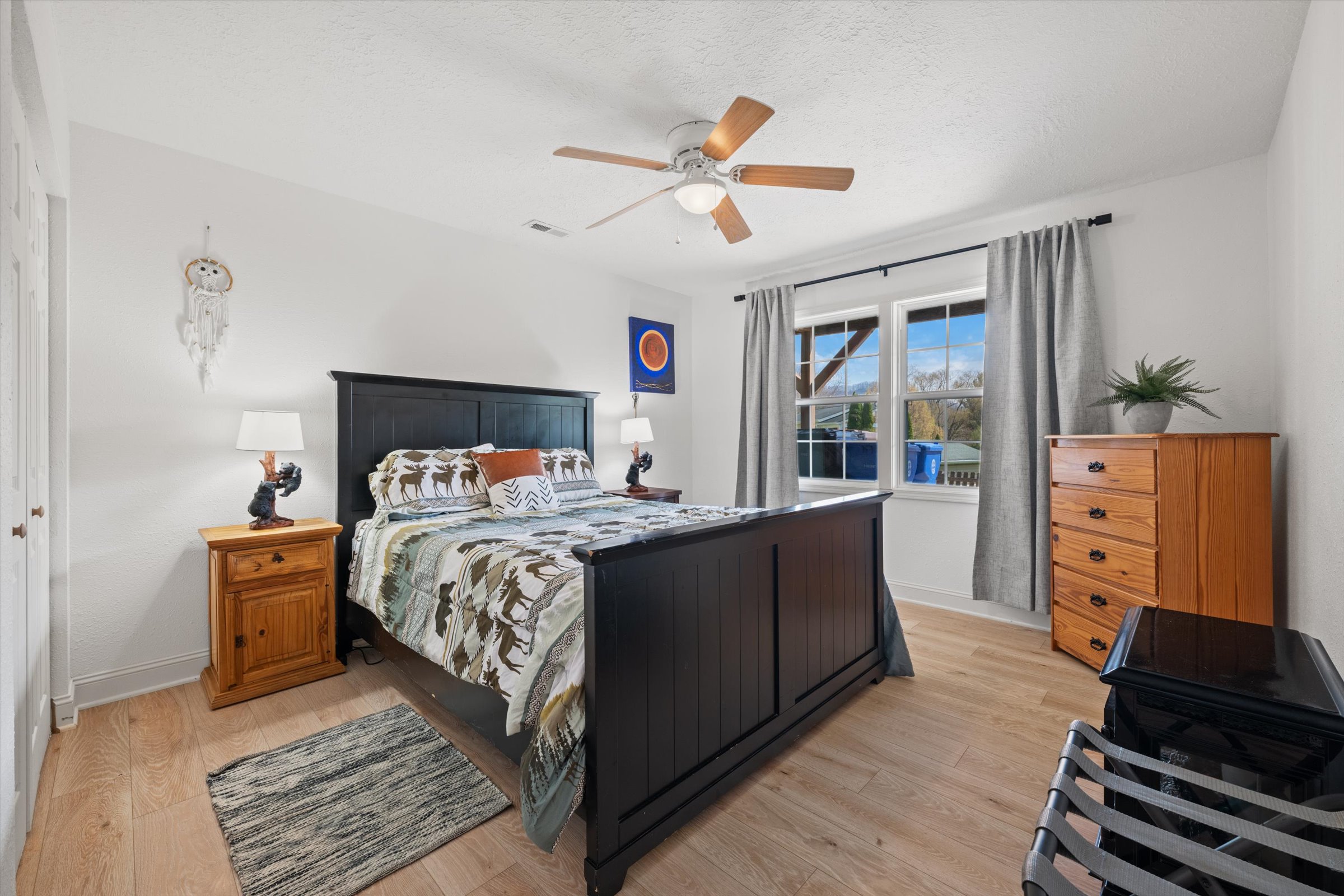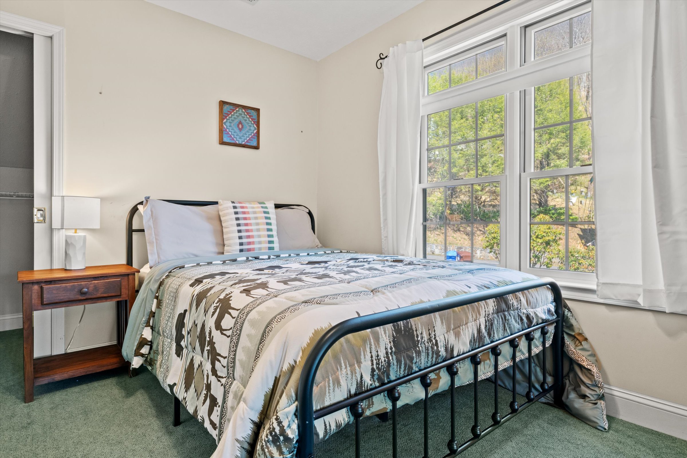 The outdoor experience is equally inviting. A wraparound deck captures mountain views and the gentle sounds of a nearby creek, creating a peaceful setting to unwind. The fire pit area, complete with Adirondack seating, offers a natural gathering space for evenings under the stars, while the yard provides additional room to enjoy the outdoors.